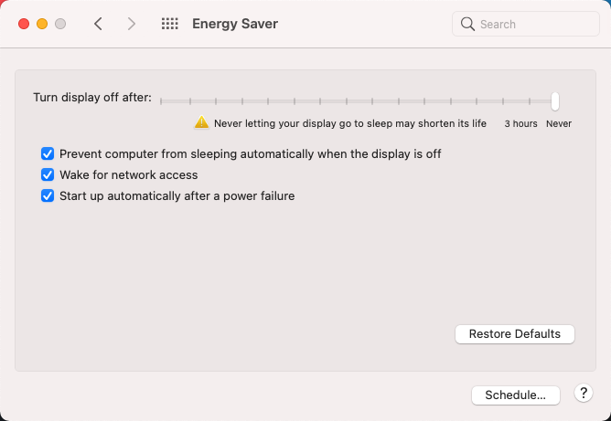 To maintain connectivity, the Mac must not sleep! Configured via GUI